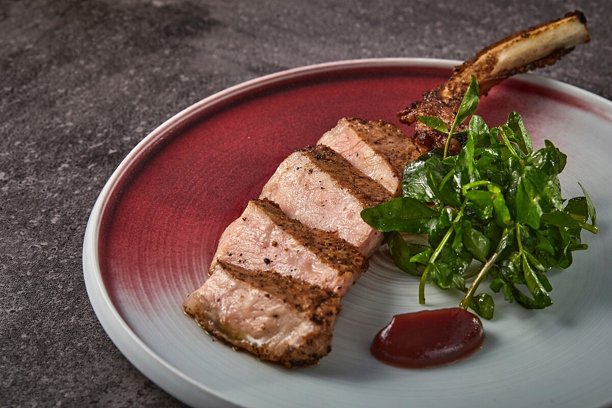 擁有「全球最美味豬肉」之稱、被視為西班牙國寶的伊比利豬,帶有堅果氣息的肉香、油脂分布完美可與 和牛媲美。 Alma 選用伊比利豬的里肌部位,油脂偏少但肉質紋理整齊優美, 經過反覆三次以上的煎烤與靜置反覆烹調,完美保留緊實有嚼勁 的粗獷口感,搭配紅酒蘋果泥醬汁的香甜與丹寧味、再綴以新鮮 水田芥特有的微苦嗆辣,香而不膩且多汁味美。