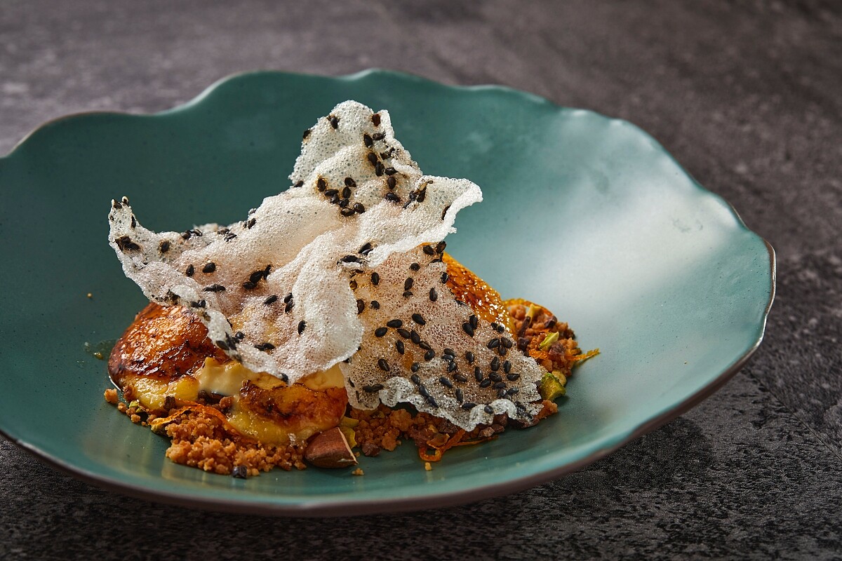14 世紀出版的西班牙食譜書《Llibre de Sent Soví》中所紀錄的烤布蕾作法,是當今世上已知最早出現這款食物之文獻,也是全球布丁食譜的雛形。 主廚為求在傳統中創新,將雞蛋蛋液添與柑橘汁均勻攪拌,增加爽口 清香,另外搭配開心果、可可豆顆粒和奶油酥餅等多種脆口果乾 混合,連同以烘乾方式製作、散發樸質米香的米餅與芝麻粒,為原本的焦糖布丁加入繽紛的驚喜口感。