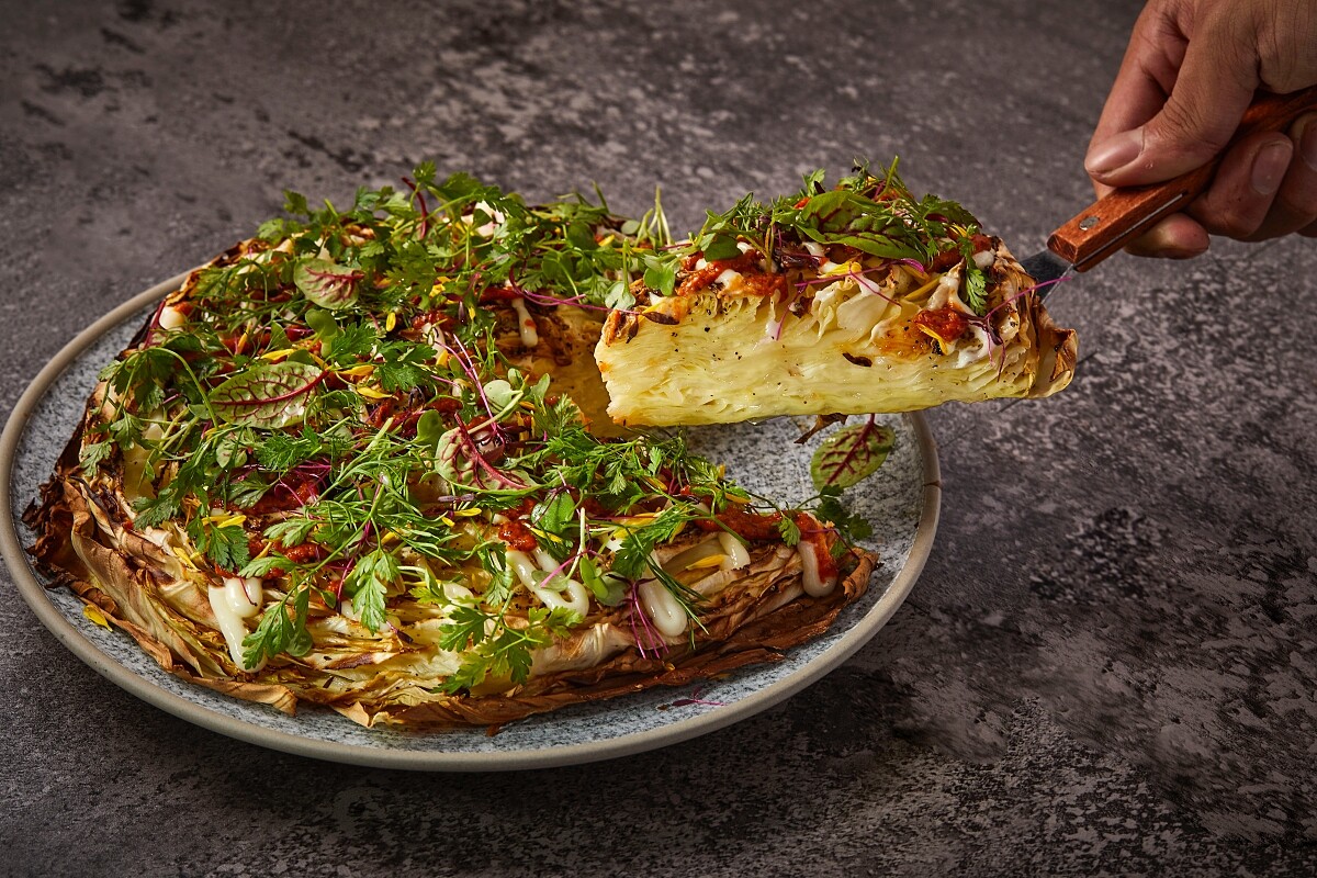 此道烤蔬菜,主廚選用台灣最甜美的當季高麗菜,加入混合西班 牙紅椒堅果醬、番茄、酸奶與多種醋漬香草,先經高溫烤至微焦 糖色,讓外層蔬菜帶有炭烤爽脆、內層蔬菜仍保清甜香軟,賞心悅目營養可口。