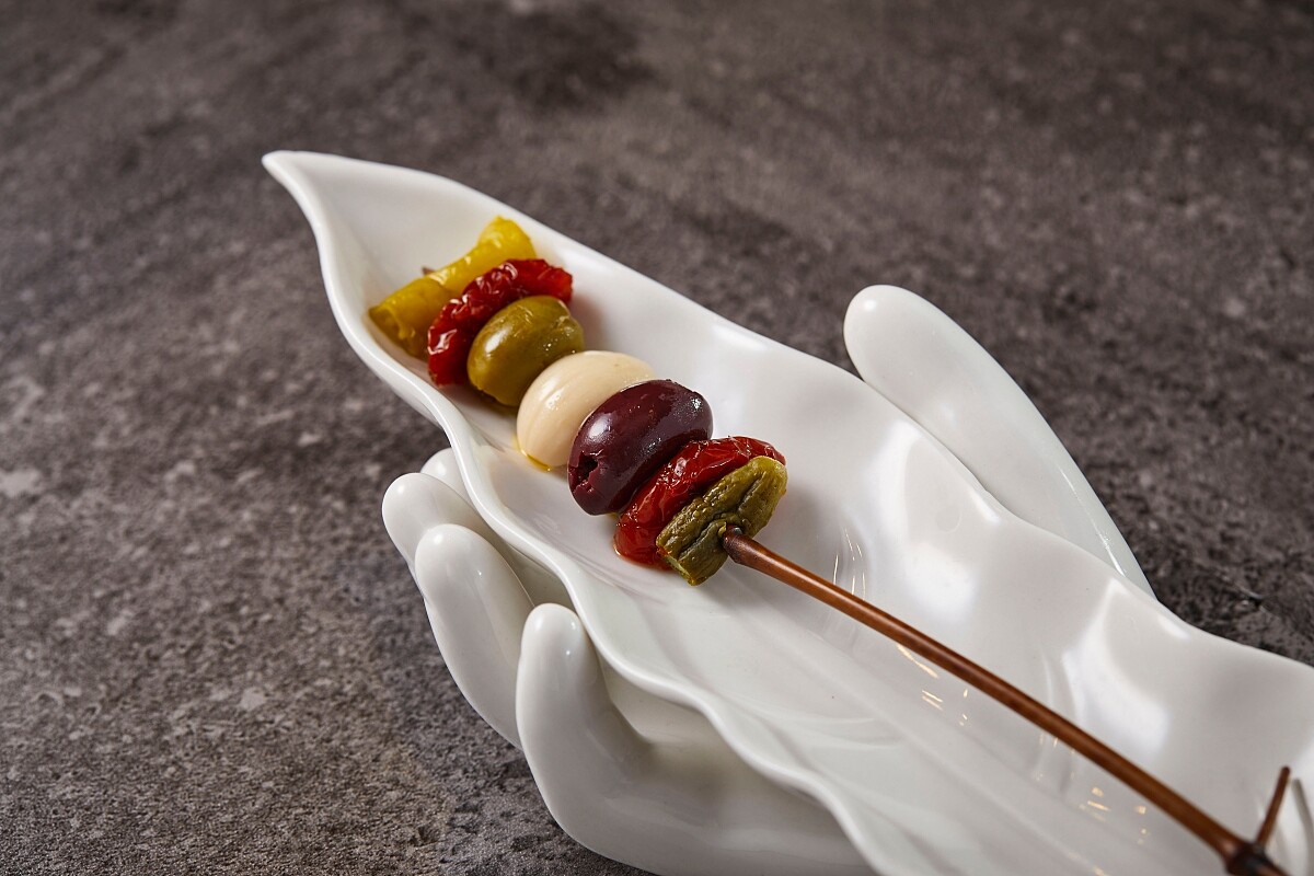 西班牙各大酒吧必備、被譽為西班牙國民鹹菜的吉爾達,將多種 醃製蔬菜串起食用,一口濃縮了鹹香嗆辣的酸爽滋味,自1946年 從北部聖塞巴斯蒂安市問世以來便深受喜愛。 主廚為了展現西班牙多元食材的好風味,讓消費者可一次品嘗, 他取其醋漬綠辣椒與醃黃瓜的酸、油封紫橄欖的苦與蒜頭的辛 辣,另外特別加入台南家鄉特色名產番茄蜜餞,取其香甜的特色 完美平衡了鹹酸、辛辣、苦澀的不同滋味,最後再加入大量的香 草、柑橘、薄荷和百里香等香草調味增添風味。 一串完食不僅一次品嚐了酸甜苦辣的滋味,彷彿已環遊西班牙一 圈、將各地特色食材風味盡收腹中。