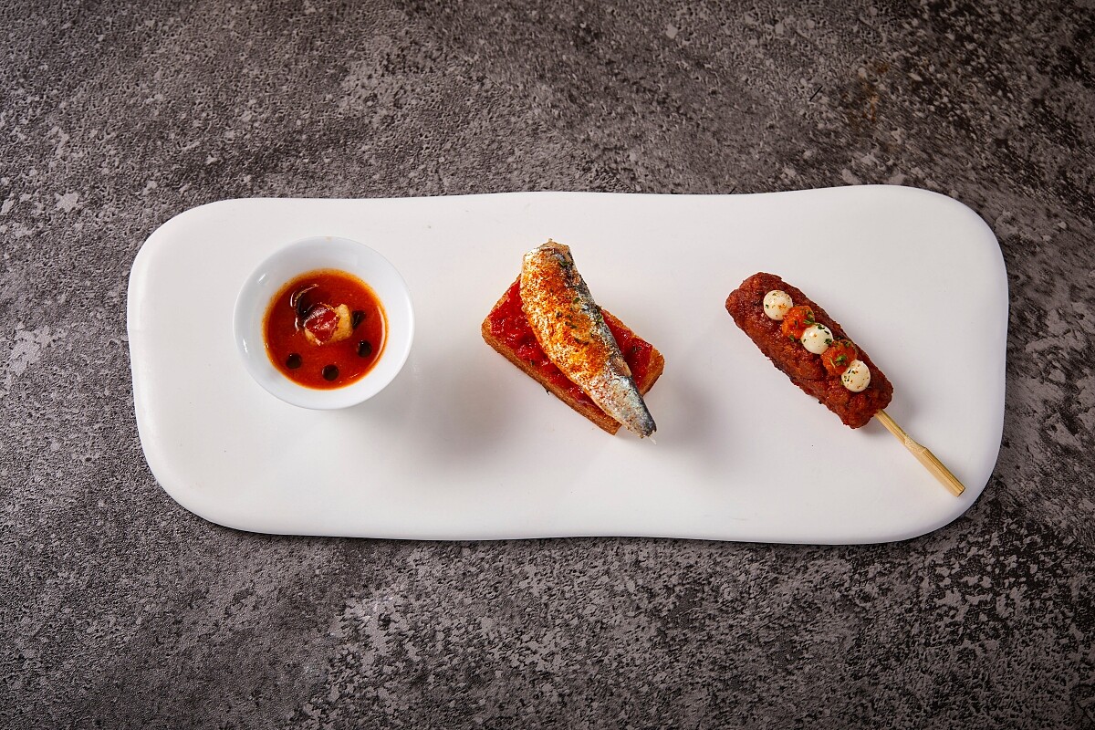 西班牙的沙丁魚產量稱霸全球,主廚特別將麵包以橄欖油香煎入味,鋪上特選油脂豐厚且芳香的沙丁魚,搭配火烤過的紅甜椒與雪莉醋攪拌調味,最後撒上些許 西班牙煙燻紅椒粉增添層次,馥郁的酸甜果味巧妙地將沙丁魚的 細膩風味提升到極致。