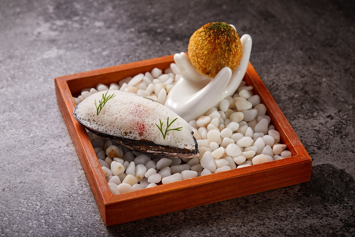 西班牙 Tapas 必吃排行榜上有名的油醋淡菜,新鮮的彷彿剛從海水 中撈起、仍殘存些許浪花拍打過的輕盈泡沫,暗藏著主廚的巧 思,碩大飽滿的淡菜以醋漬醬汁浸泡輕醃、泡沫則是取自真正海 水與淡菜本身的汁水調味自帶一股鹹鮮,上方添加自製的醋漬蔬 菜達到畫龍點睛之效,更加烘托出淡菜特有的甘甜滋味。