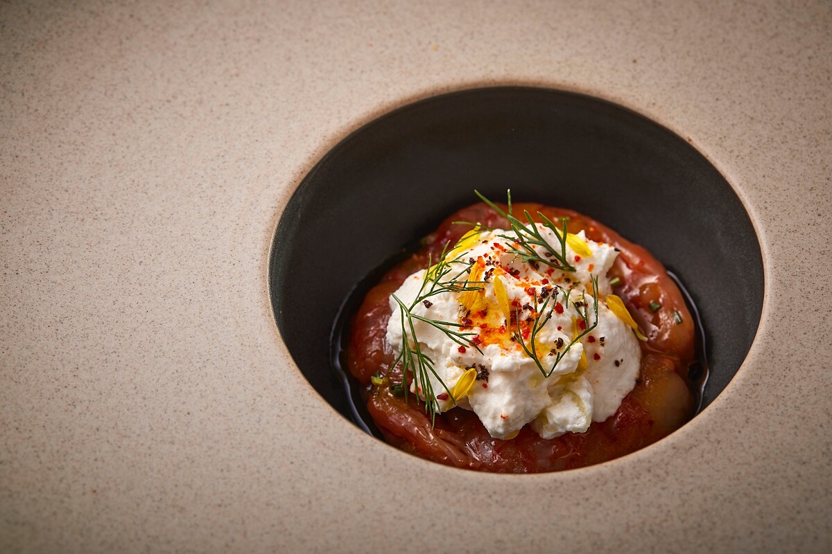 西班牙當地特有的冷湯文化,源自安達盧西亞的番茄冷湯最為經典,主廚則以「血腥瑪麗」為設計概念再加入大量的辛香料,使用台灣牛番茄取其酸度與香氣,再加入聖女番茄增加甜度,以甜椒、洋蔥等多樣食材,連同雪莉醋打成汁後靜置一夜,讓風味完整釋放,過濾後淋上羅勒油與自製蒜味麵包與炸火 腿,激盪出清爽開胃的絕妙平衡。