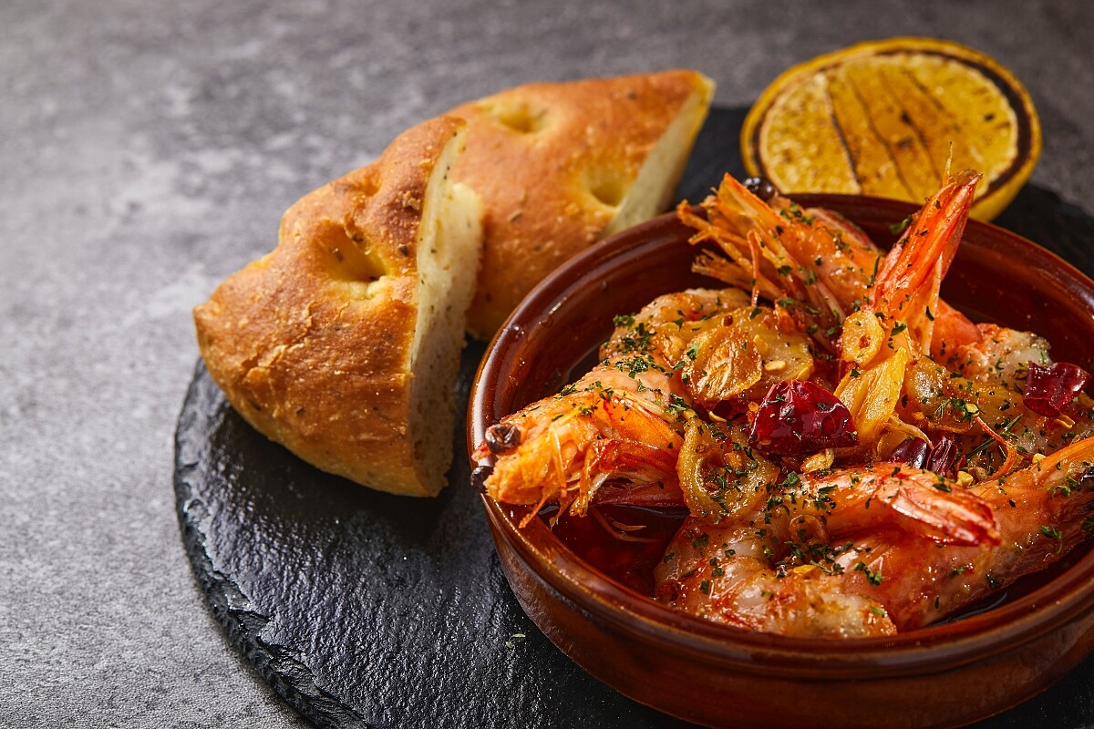 西班牙當地最受歡迎的 Tapas 之一,一般作法則將鮮蝦與蒜片放入 滾燙的橄欖油中,以慢火浸出令人吮指的噴香美味。 主廚選用生食級藍鑽蝦,但在熱油的作法卻顛覆以往,先以大量 蝦頭、橄欖油和辛香料熬製基底,煉製蝦油後,最後放入燒熱的 竹炭增加煙燻香氣,色澤特別紅潤且香氣更強烈,讓每隻鮮甜扎 實的白蝦都完美包裹上滿是蝦鮮、蒜味與炭香的濃郁醬汁,與烘 焙過程中特意將麵包體保留氣孔、更方便吸收醬汁的鬆軟佛卡夏 簡直絕配。