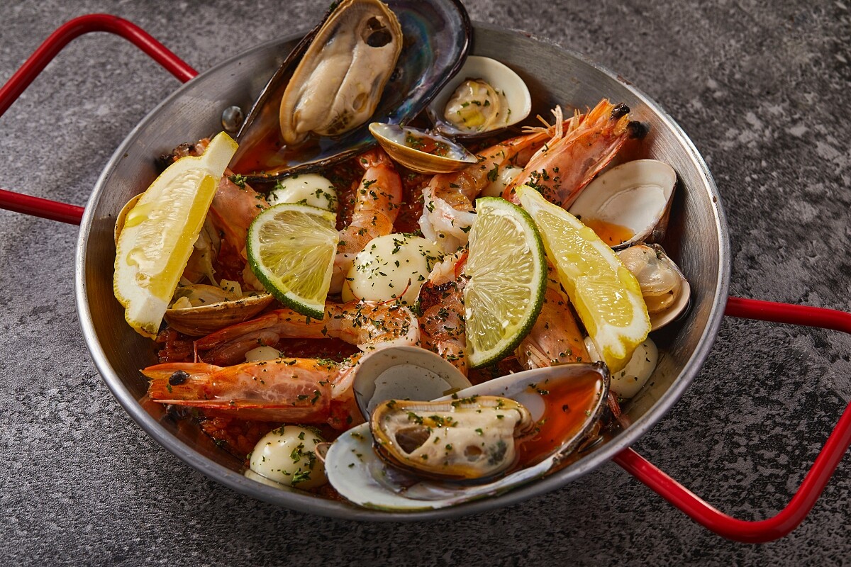 相傳是15世紀時哥倫布因颶風襲擊、逃生至西班牙小島,當地漁民便是以這道菜款待他,而後成為西班牙當地招待尊貴客人的佳。主廚選用口感堅實的西班牙 Bomba 米,以甜椒、洋蔥與蒜頭為 基底,有別於一般常見以魚骨或蝦頭熬煮的海鮮湯頭為基底的作法,為增加高湯鮮味以連骨帶肉整隻鱸魚熬煮成魚湯、蝦頭精華熬製的蝦湯與蛤蜊湯三鮮齊下提味,顆顆米粒 飽吸豐美的海鮮湯汁,濃郁的海洋氣息迴盪在舌尖,底層的焦脆鍋巴則是脆口的意外之喜。