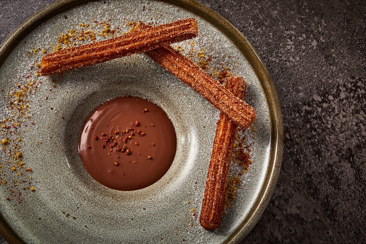 據說原是牧羊人在山野放牧時為自己準備的果腹小點,如今為西班牙街頭國民小吃的吉拿棒,廚循傳統作法先以燙麵方式製作麵糰,混合清水與油煮滾後倒 入麵粉中去揉打成糰,再純手工擠壓成星星形狀;均勻沾裹一層 帶著晶瑩細顆粒的肉桂糖粉,酥脆的外皮與白嫩軟糯的內裡口感十分討喜,另外以72%微苦海鹽巧克力醬與陳酒和杏仁酒混合, 撒上帶香氣的粉紅胡椒,為視覺與味蕾堆疊雙重的芳香迷人。