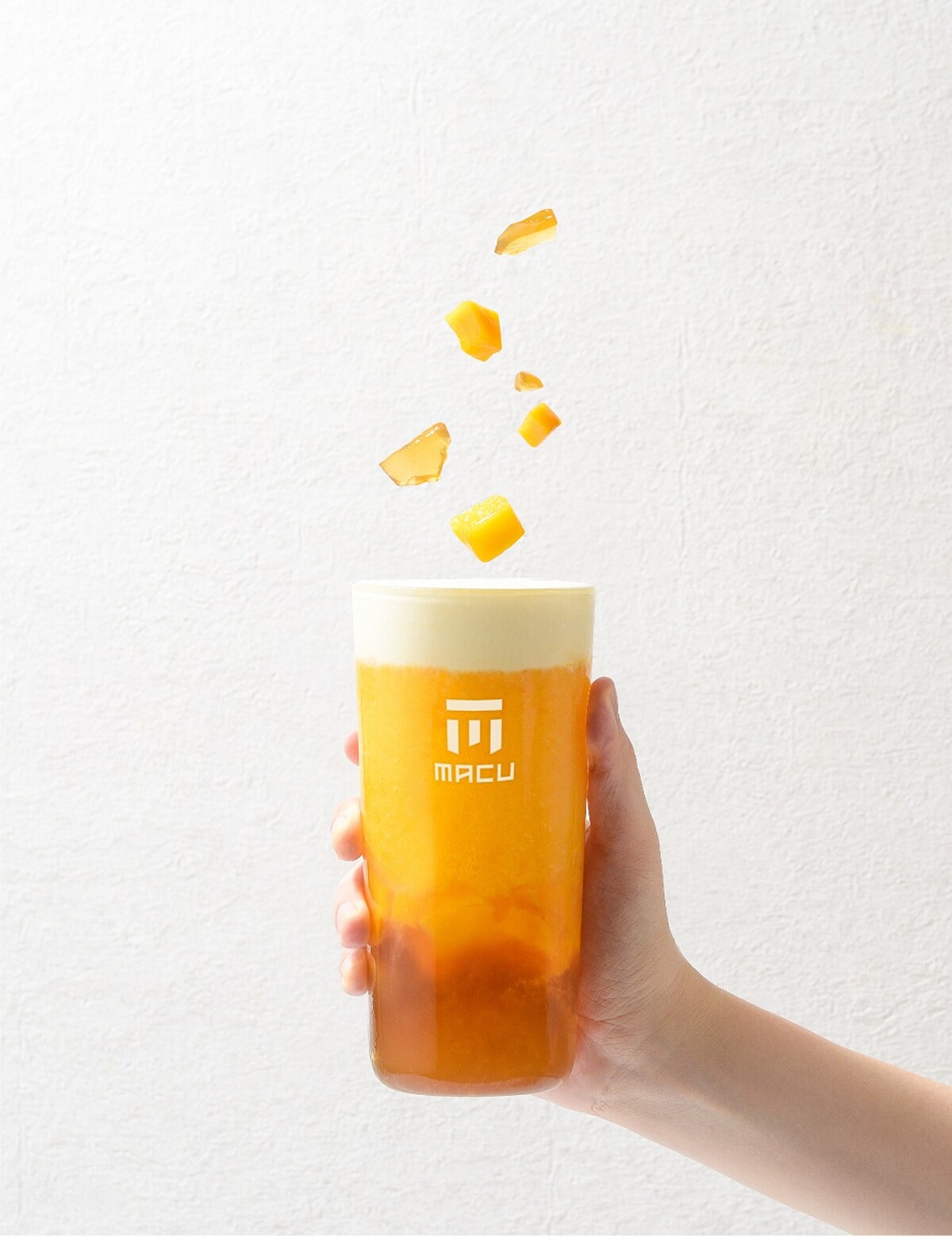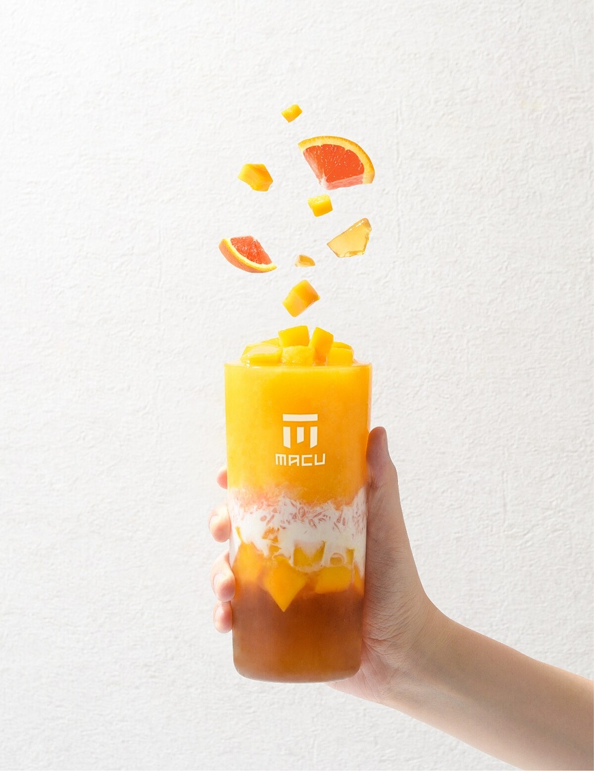 底層加入清爽的綠茶凍,以及嚴選新鮮的愛文芒果製成的芒果冰沙,再放入新鮮現切的芒果果粒與葡萄柚果粒,接著倒入特調椰奶,更增添風味層次,每口都充滿驚喜感,多層次的風味與口感也成為了手搖飲控們夏天最期待的一款手搖飲!