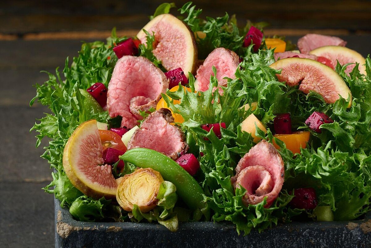 主廚將牛肉以舒肥的方式讓肉質更加軟嫩,再搭配各式生菜及新鮮水果,佐上柚子油醋醬,用酸甜滋味替奢華燒肉饗宴揭開序幕。