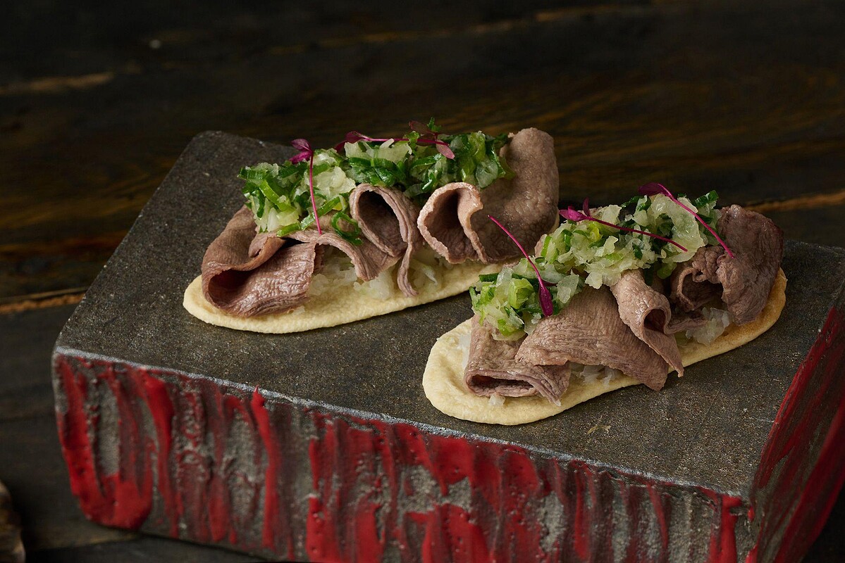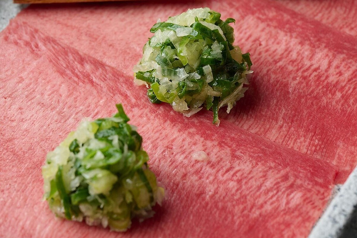 使用厚度僅0.1公分的薄切牛舌,包裹住特製鹽蔥醬,以最簡單的調味,更能帶出牛舌絕佳的風味與口感。