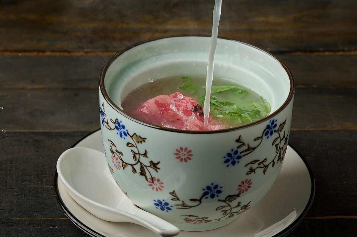 以台南涮牛肉湯為概念發想,採用高肌肉含量的和牛外腿肉部位薄切,淋上以牛骨、雞骨、甘草與馬告等熬製而成的和牛高湯,再川燙至粉嫩色,充分釋放牛肉香氣與鮮甜滋味。