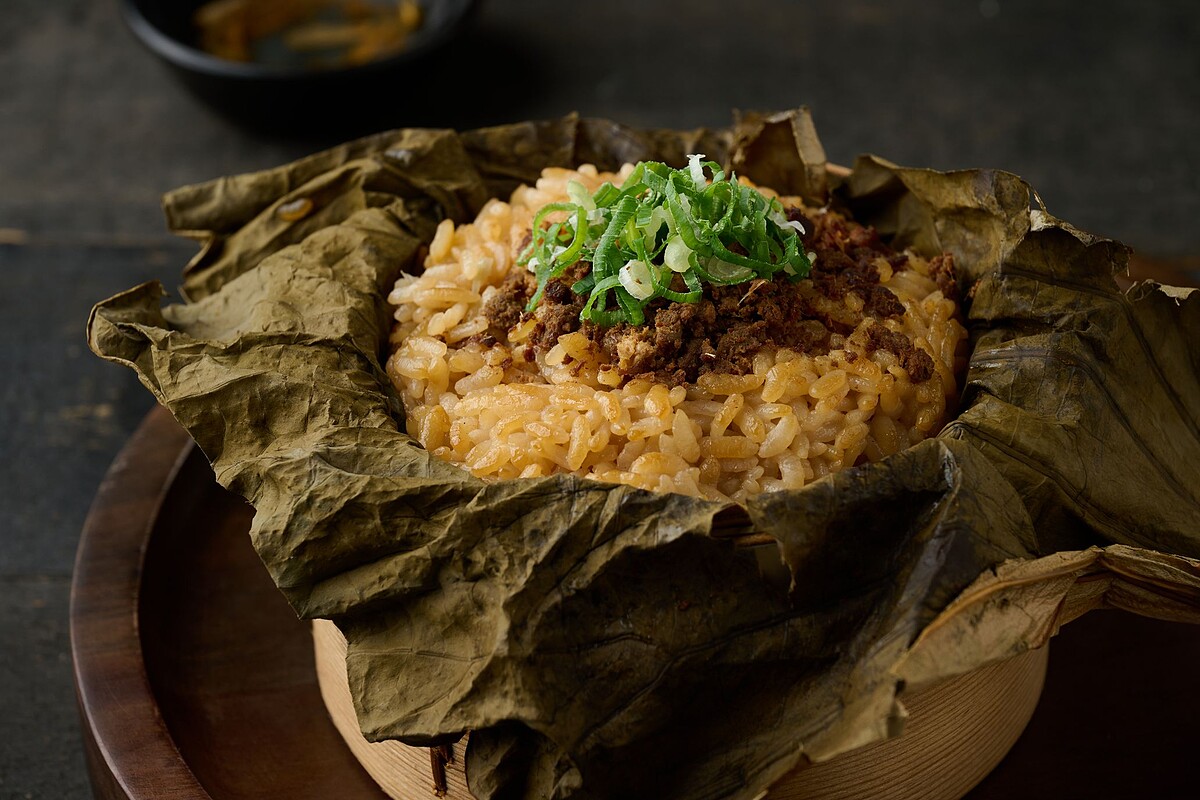以荷葉炊蒸北海道七星米,接著淋上自製的牛肉燥、精煉牛油蔥,最後拌入蔥花,粒粒分明的米粒口感,香濃而不膩口。