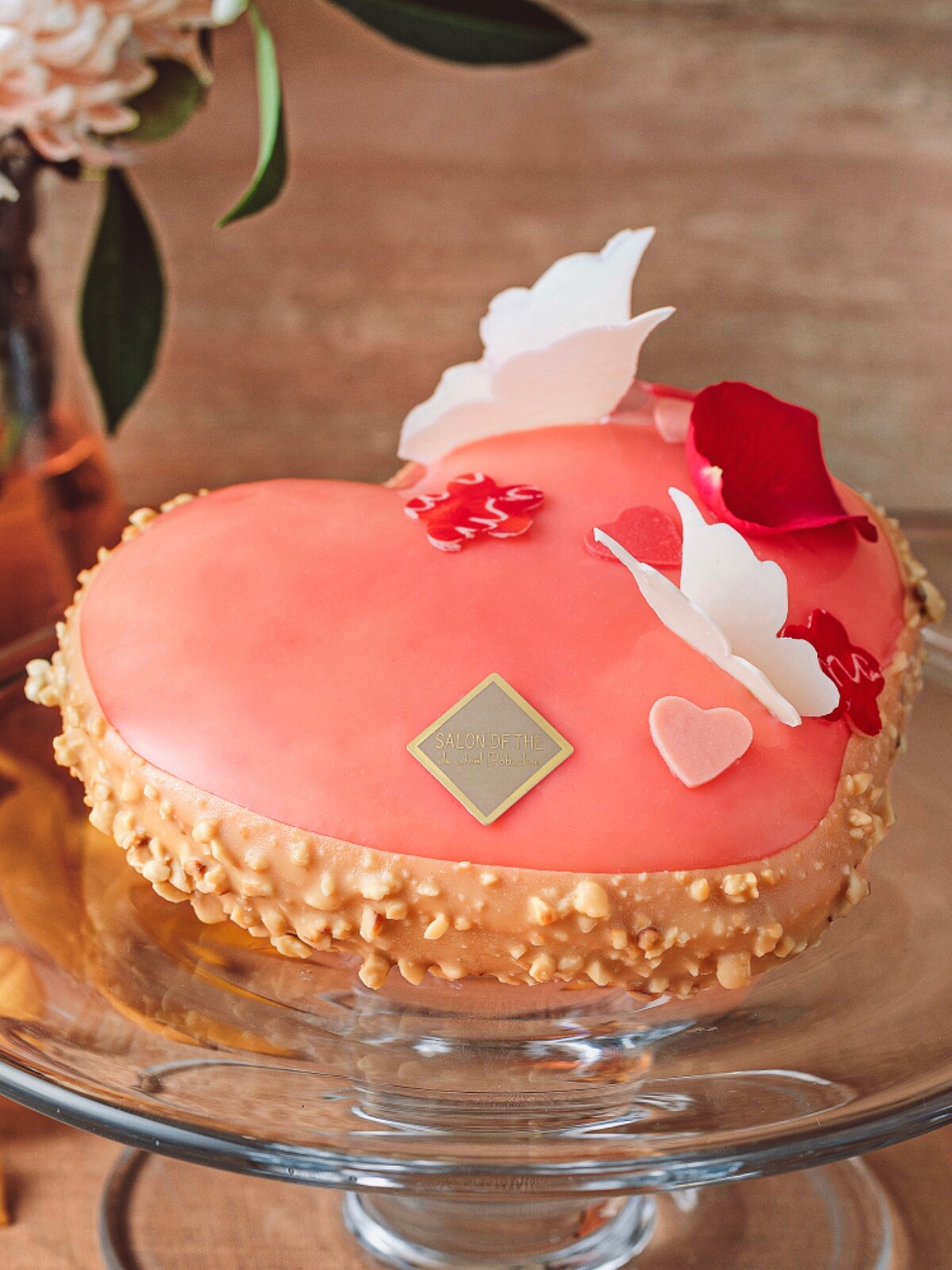 入口即化的馬鞭草水蜜桃慕斯,內餡搭以法式水蜜桃果凍,淡雅芬芳於口中層層化開,外圈包裹焦糖巧克力沾杏仁角,頂端綴以展翅蝴蝶的造型巧克力,以愛心造型呈現,表現出對母親的滿滿愛意。售價NT1,280元