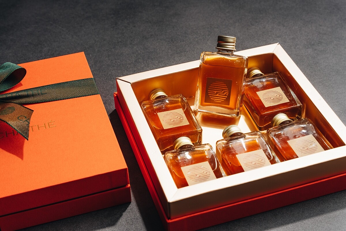 主廚使用頂級新鮮老母雞與大量蔬菜慢火熬煮出金黃色澤雞高湯,再使用細火長時間熬煮,逐步進行冷卻、去除油脂,濃縮後進行澄清,並加入牛肝菌與蟲草花、何首烏提煉風味,最後淬鍊出珍貴的法式澄清熬雞精,6入禮盒售價NT880元。