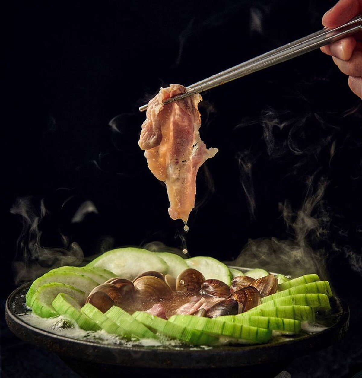這款爆炒蒜頭蛤蠣烏骨雞鍋,以麻油、大量蒜頭與烏骨雞一同爆香,搭配新鮮蛤蠣與蔬果清湯,湯頭濃郁香醇,烹煮時間越長蒜頭湯頭越加鮮甜,是蒜香迷不容錯過的美味。