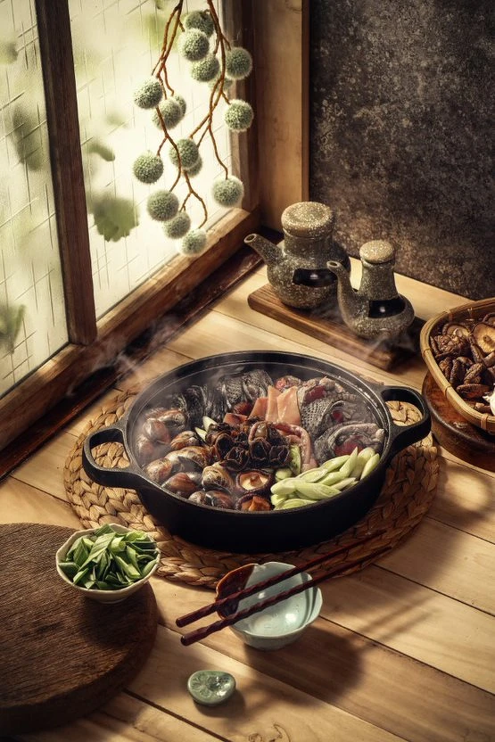這款爆炒蒜頭蛤蠣烏骨雞鍋,以麻油、大量蒜頭與烏骨雞一同爆香,搭配新鮮蛤蠣與蔬果清湯,湯頭濃郁香醇,烹煮時間越長蒜頭湯頭越加鮮甜,是蒜香迷不容錯過的美味。