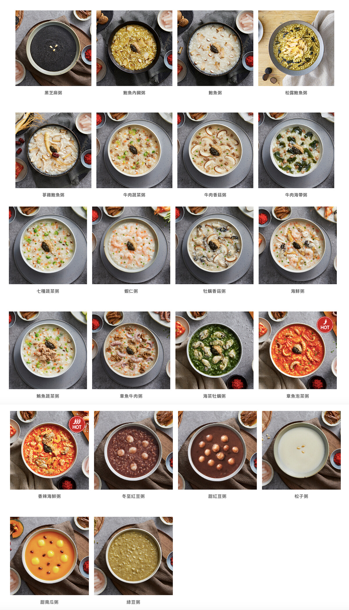 台灣「本粥Bonjuk」菜單共有22款品項可以選擇,從鹹口味的鮑魚內臟粥、蔘雞鮑魚粥、香辣海鮮粥到甜南瓜粥、綠豆粥、甜紅豆粥、芝麻糊…等通通有,餐點種類非常豐富。