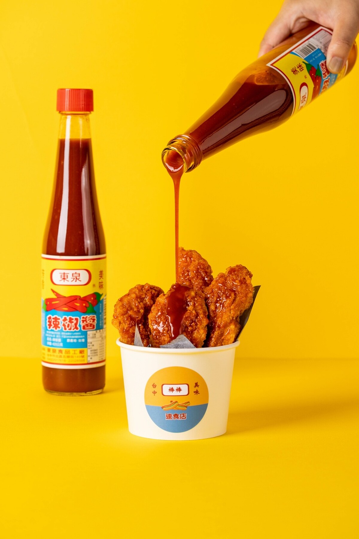 此外,門市現場同步提供整瓶辣醬,可針對不同口味的脆皮奶油熱狗堡自行添加!推薦大家升級套餐,餐點會再另外附上現炸去骨雞柳條,可以裹著東泉辣椒醬,就搖身一變成了另類台式炸雞,真的每一口都讓人超滿足!