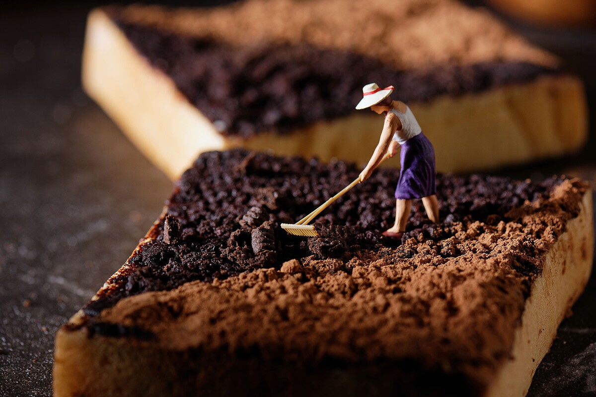 將進口黑芝麻磨成醬後,加上炒過的黑芝麻粉、馬斯卡邦起司和動物性鮮奶油製成濃郁的的黑芝麻醬,而生吐司部份則採用單純發酵奶油、純豆漿,鮮奶、動物性鮮奶油及麵粉、天然酵母發酵製成,最後將黑芝麻醬抹在桿平的麵團上捲起,利用整形方式揉卷成型;再以長時間低溫發酵再烤製後,切面是漂亮的大理石紋路,入口時感受濕潤柔軟,與迷人的黑芝麻香氣。
