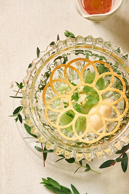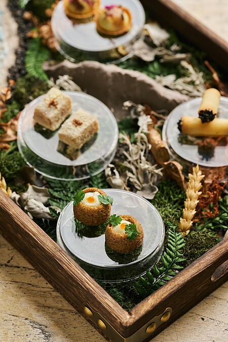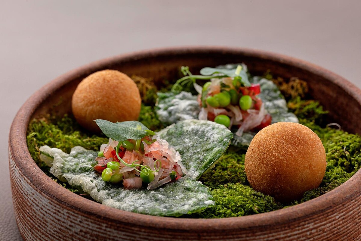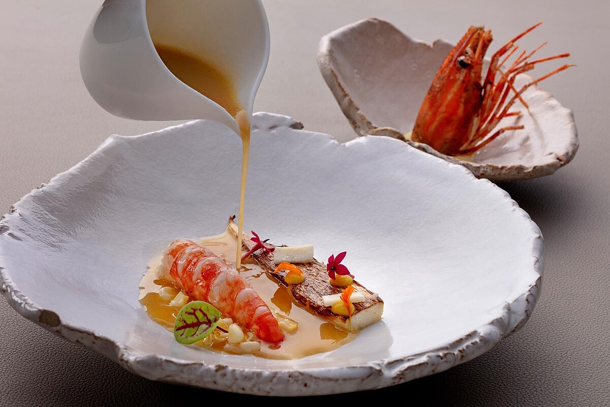 前菜就多達6道,從加入各式秘製辛香料、雪莉醋以及羅勒油,打造的著名「 番茄冷湯」替美好的一餐揭開序幕。而經典鹹菜「吉爾達 」 以醋漬綠辣椒、醃黃瓜、油封紫橄欖與主廚家鄉名產台南番茄蜜餞的獨創搭配,將酸甜苦辣完美融合在一起。