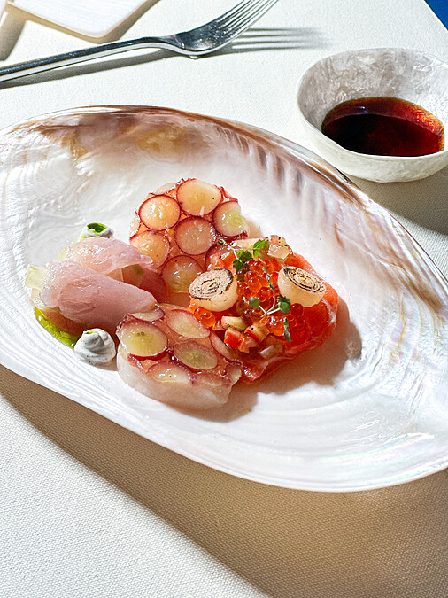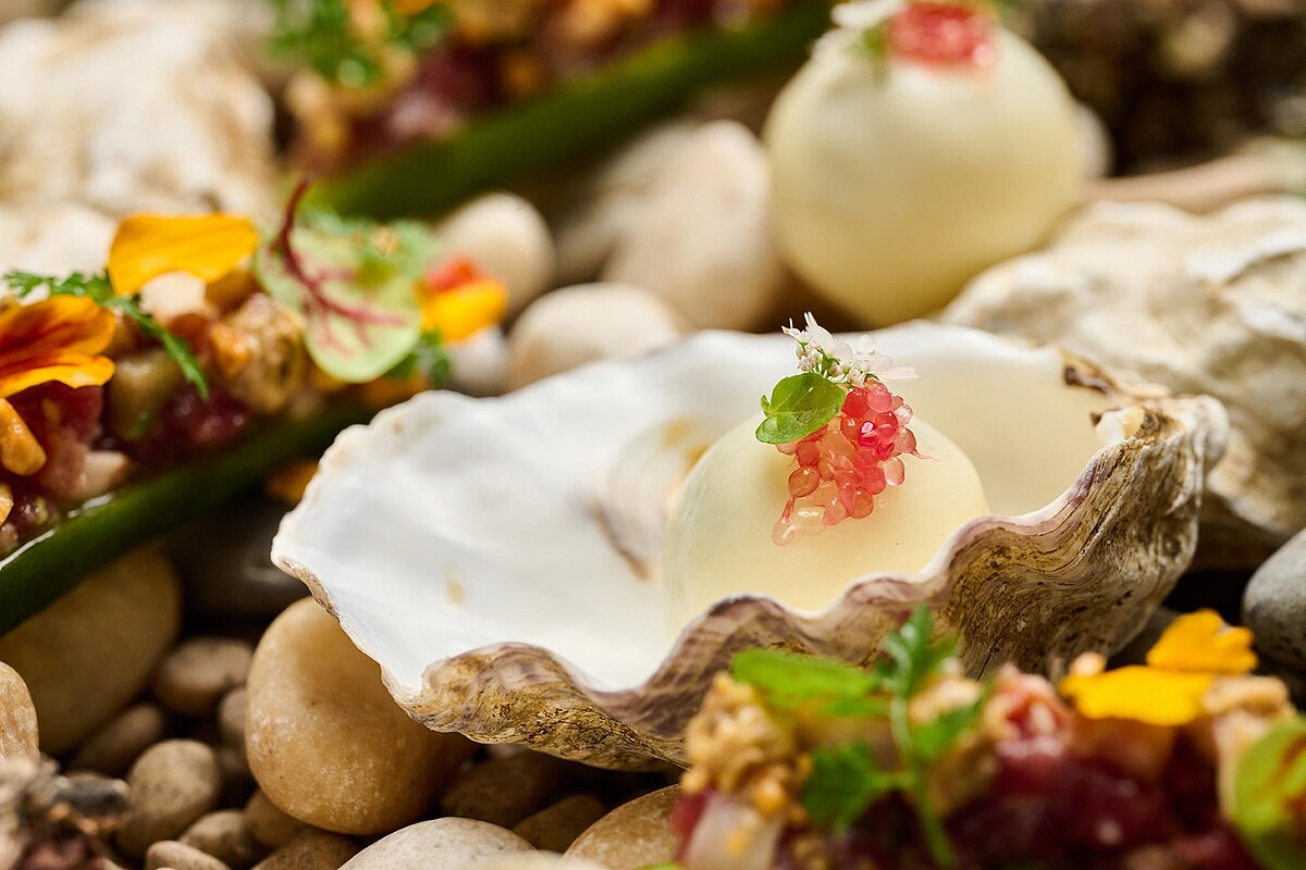 全新的「主廚餐桌預約制私人套餐」主打當代料理風格,並融合品牌故事。餐點從首道「海洋SEA」一直到最後的「天空SKY」,透過料理敘事的方式,結合各種頂級食材,加入了海洋元素,融合淺灣、岩岸、潮汐、大地等自然元素,賦予食材獨特的風貌。