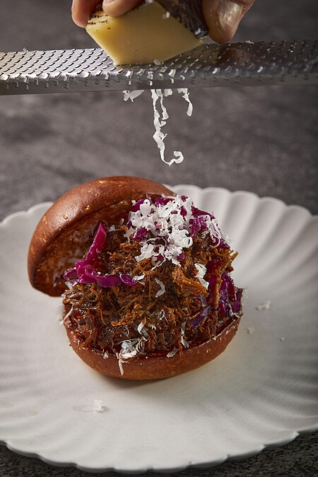 還有不能錯過「Alma招牌手撕豬漢堡」,這道料理其實源自於主廚在西班牙旅遊的記憶,結合了西班牙燉肉手法搭配煙燻紅椒粉,將燉肉透過手撕的方式讓肉質更加軟嫩,入口即化。