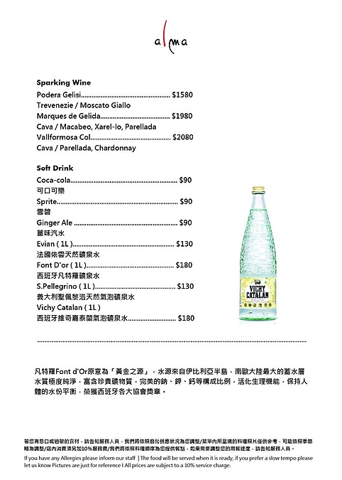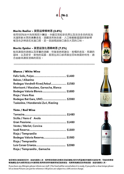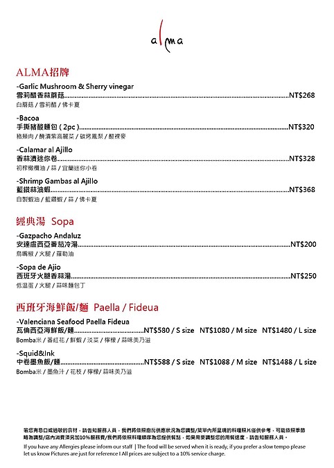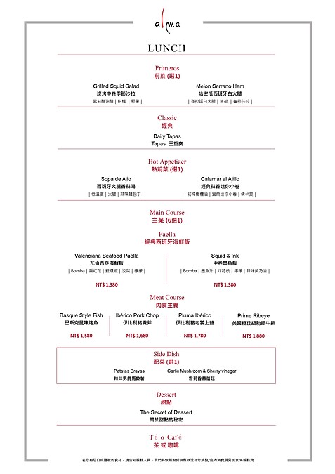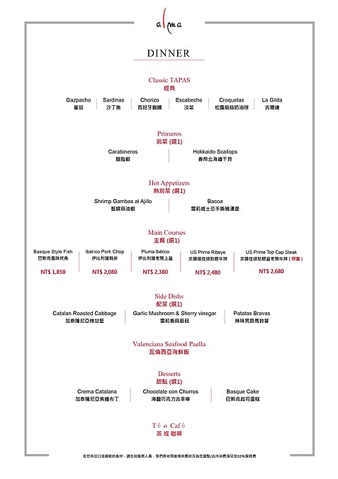《Alma Spanish Restaurant》2023年喜迎具有米其林星級餐廳經驗豐富的新銳主廚劉子豪 (Leo Liu) 擔任餐飲總監,料理顛覆傳統手法,但又維持了西班牙料理精髓,大膽翻玩西班牙經典國菜,將番茄冷湯化身為 「血腥瑪麗冷湯」、海鮮燉飯大升級成「三鮮豪華燉飯」等,讓老饕一改濃厚醬汁的印象,透過細膩手法創造出更具層次的風味。推出在台灣十分罕見,以 Tapas 主題的12款菜色晚間套餐,一人每人只要 1,850 起,CP值爆表!