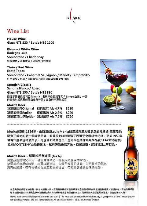 西班牙餐廳 《Alma Spanish Restaurant》是國際知名的雅茗天地餐飲集團旗下品牌之一,更是連續四年先後獲得上海「必比登推薦」、「米其林餐盤推薦」的肯定。《Alma Spanish Restaurant》店面座落於大安區,菜單提供各式正宗西班牙料理深受饕客好評。2023新菜單的全新套餐不只高CP值,口感與風味也更具層次,每一道料理透過不同食材的搭配碰撞出新火花!