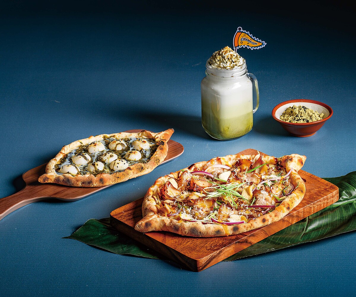 《Tino's Pizza堤諾義式餐廳》2款龍舟比薩端上桌就讓人超驚喜,透過職人以巧手捏出船身弧度,內餡再加入新鮮配料精心研製,接著以400度高溫烘烤出微微焦香,將義式豹斑餅皮與台灣在地食材完美結合!再搭配奶霜擂茶拿鐵上的旗幟,呈現「雙龍搶珠」奪旗的經典畫面,讓大家在餐桌上體驗一場趣味「龍舟競賽」,感受濃濃端午節氛圍。