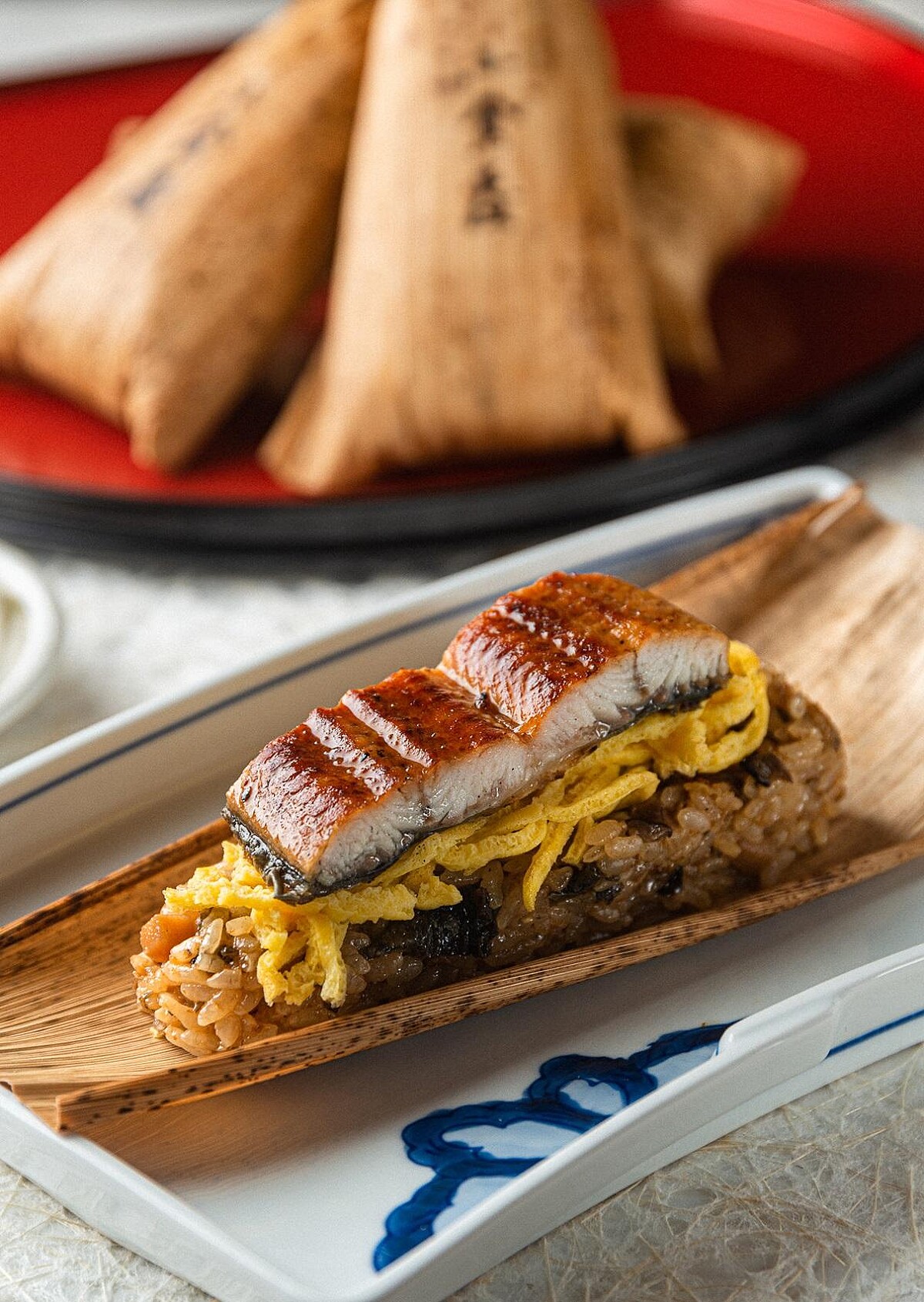 而《小倉屋》為了讓每一口都能品味到最佳的味道和質感,製作過程需要仔細混合各種餡料。首先,一層香氣四溢的糯米飯餡料,再加上金黃酥脆的蛋絲,最後再加入費工烤製的鰻魚,將食材精心地鋪滿在粽子上,層層堆疊出美味且多層次的口感。