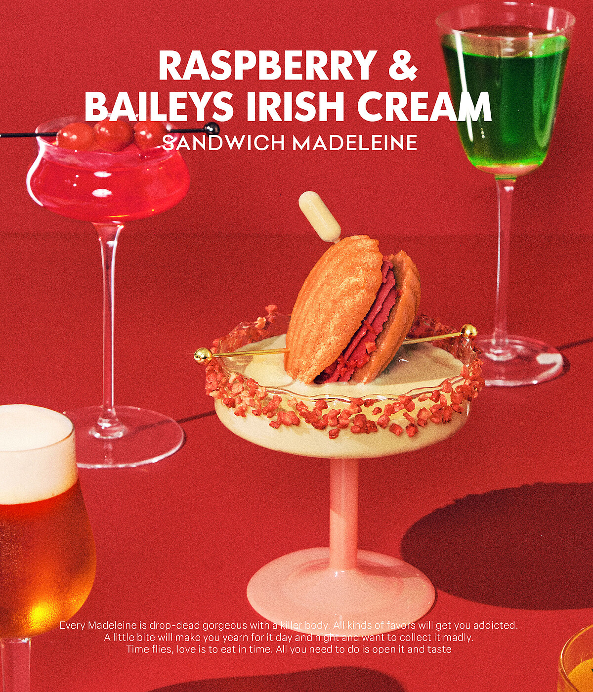 由內到外都粉紅迷人的瑪德堡也展現了關關的形象代表色!採用世界頂級法芙娜覆盆子奇想巧克力,搭配愛爾蘭貝禮詩奶酒,一口咬下感受微酸的莓果果醬與乾燥草莓碎粒,伴隨著貝禮詩奶酒的酒香,是一款大人系風味的療癒甜點!
