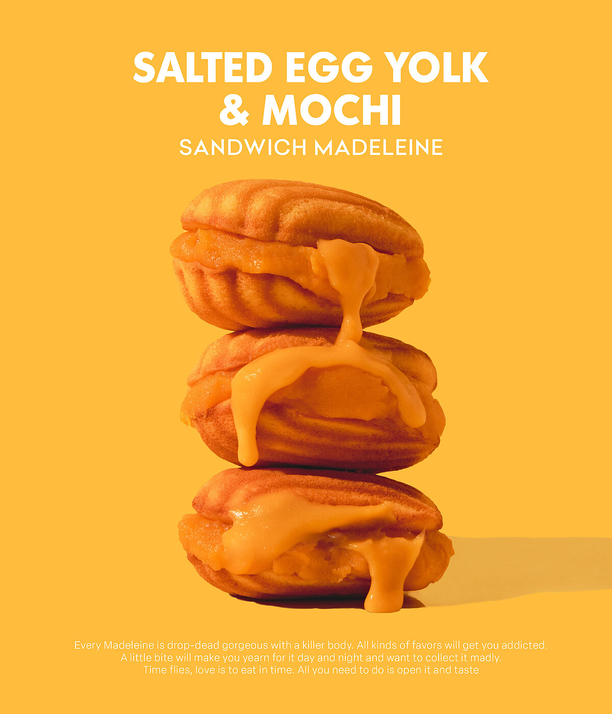 還來點鹹口味絕對要試試這款「厚夾奶黃瑪德堡」!靈感來自關關最喜愛的鹹蛋黃,先在瑪德堡外圈加入濃郁的鹹蛋黃醬,入口後品嚐香濃的金沙奶黃流心與麻糬口感,真的是太涮嘴了!推薦大家還可以加熱後享用,加熱後牽絲麻糬的口感真的是太迷人啦!