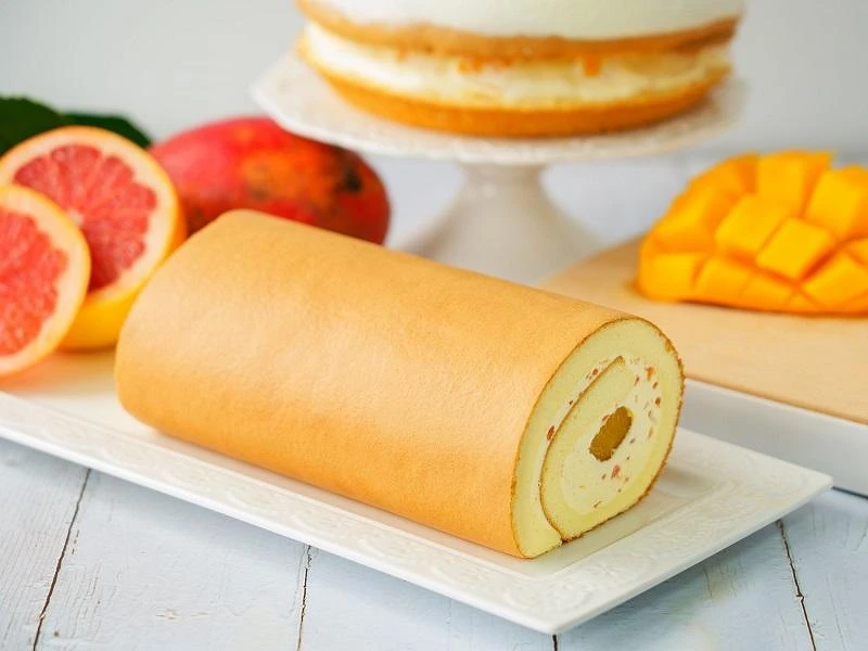 楊枝甘露是經典的港式甜品,《普諾麵包坊》甜點主廚把「楊枝甘露」變成蛋糕捲啦!以香甜多汁的愛文芒果,搭配芒果鮮奶油製成內餡,再加入葡萄柚果肉一同捲入柔軟的香草蛋糕中,入口感受酸甜果香與醇厚的奶香滋味,真的會一不小心就完食啦!