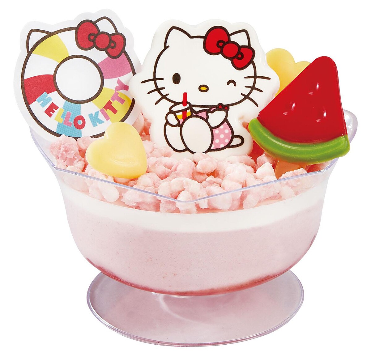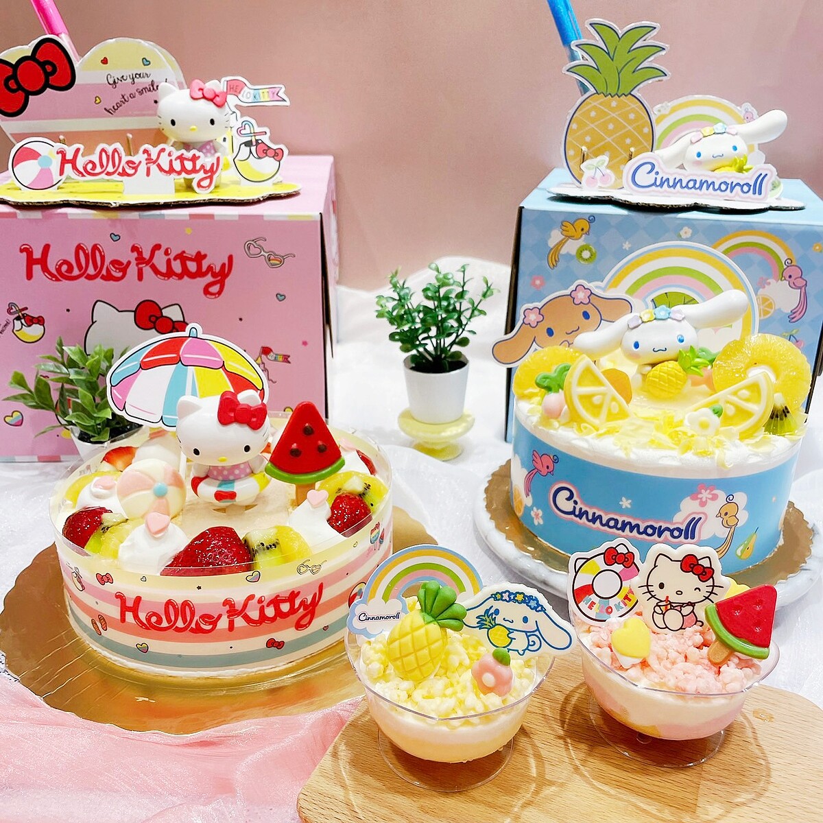 Hello Kitty穿著粉底白點的泳裝,帶著可愛的游泳圈,在夏日海灘旁快樂玩耍,蛋糕上海灘球與西瓜造型巧克力搭配酸甜草莓與滿滿水果,充滿夏日氛圍感,一次滿足大家的視覺與味蕾,蛋糕吃完後記得收藏上面的HELLO KITTY公仔!