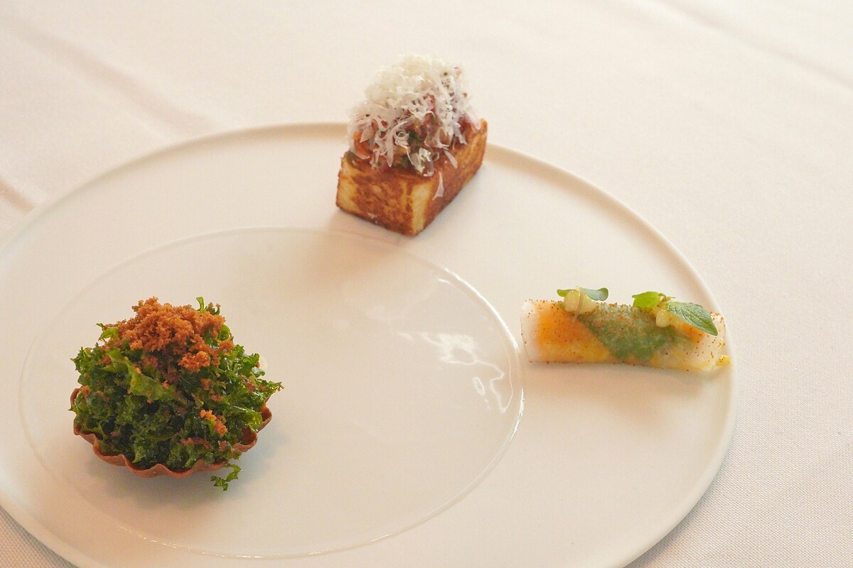前菜小點有三款,左起為使用塔皮裝載調味過的花椰菜泥,中間則有酥炸過的羽衣甘藍,最後刨上台灣盛產的烏魚子增加香氣。右方為醃漬過的白蘿蔔片,夾上南瓜泥與帝王蟹作為餡料,清爽又開胃。中間為自製的布里歐許麵包,麵體有奶油濃郁的香氣且口感軟嫩,搭配上拌入酸豆與番茄的西班牙臘腸,最後以帕瑪森起司點綴在上方,滿口鹹香馥郁的滋味作為完美的開場。