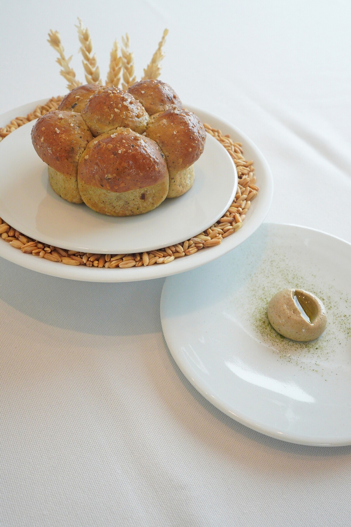 為廚房每日現做的麵包,將傳統布里歐許麵包加以變化,融入昆布、海苔以及海藻的鮮味,搭配上昆布奶油,上面再加入自行提煉的昆布油,讓麵包與奶油佐料呈現一致的風味調性,不僅有奶油香氣尾韻更有飽滿的旨味。