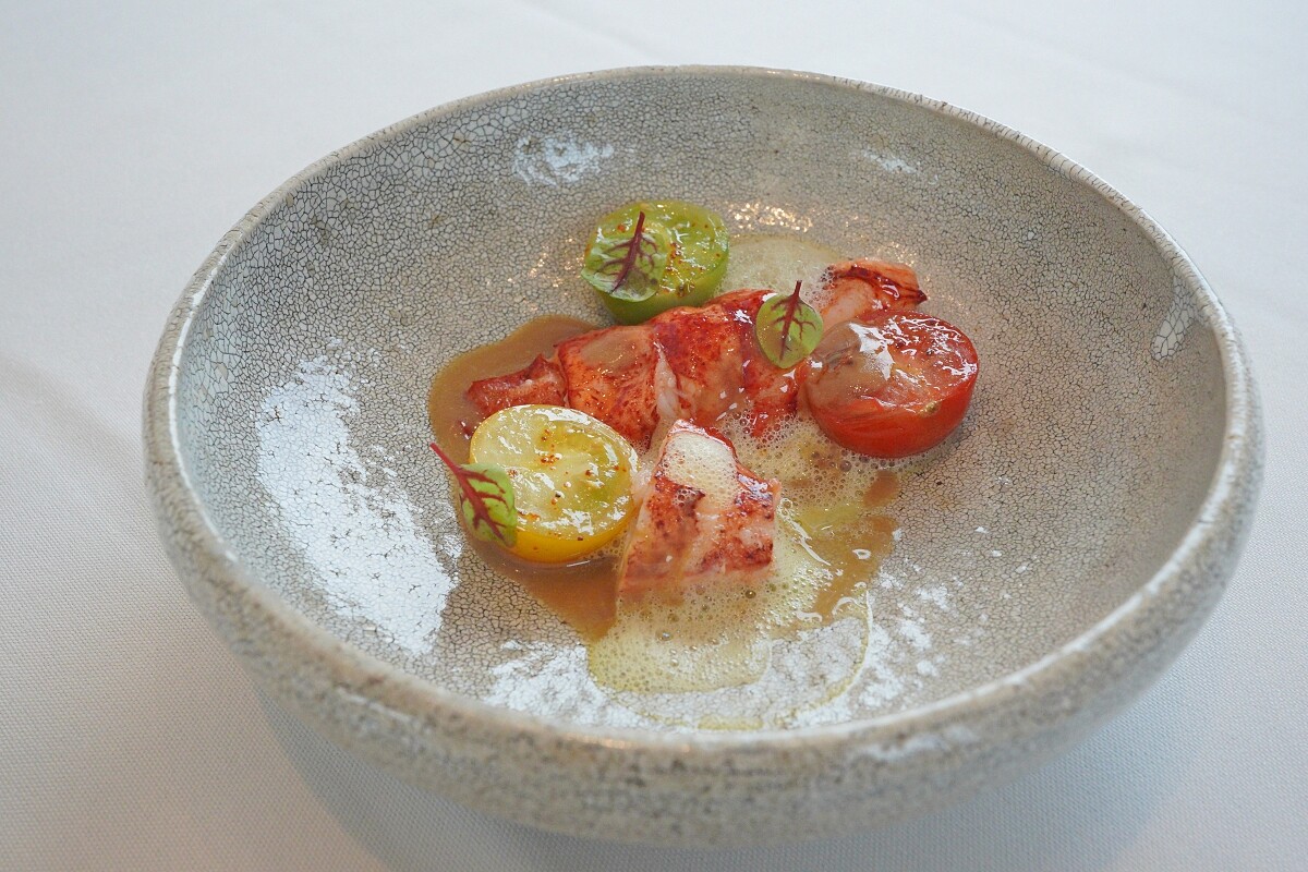 以適當的火侯煮製龍蝦,並加入以蝦殼、蔬菜精心熬製的濃湯,而番紅花與埃斯佩萊特(Espelette)辣椒製成畫龍點睛的泡泡。此調味選用源自主廚生長自法國巴斯克地區一帶,當地喜好在春夏之際以埃斯佩萊特辣椒製作料理,它同時世界最知名的辛香料之一,常用於在火腿、血腸或是肉凍的調味,甚至連巧克力也能作為提味香料,同時也形成了當地飲食的特色風味。