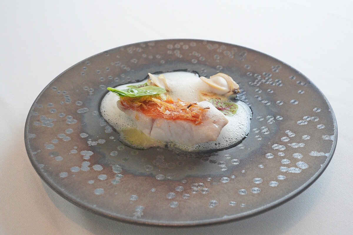 選用新鮮的金目鯛,以炭烤的方式料理,展現直火與鮮魚交會的香氣,盤底則有法式蔬菜泥,並以檸檬、奶油做調味,一旁則是當季最甜美的綠竹筍,同樣以炭烤方式引出其鮮甜細緻的口感,搭配上鮮美的蛤蜊,最後淋使用日式高湯(だし)製作的泡泡,讓整個風味勾勒串連在一起。