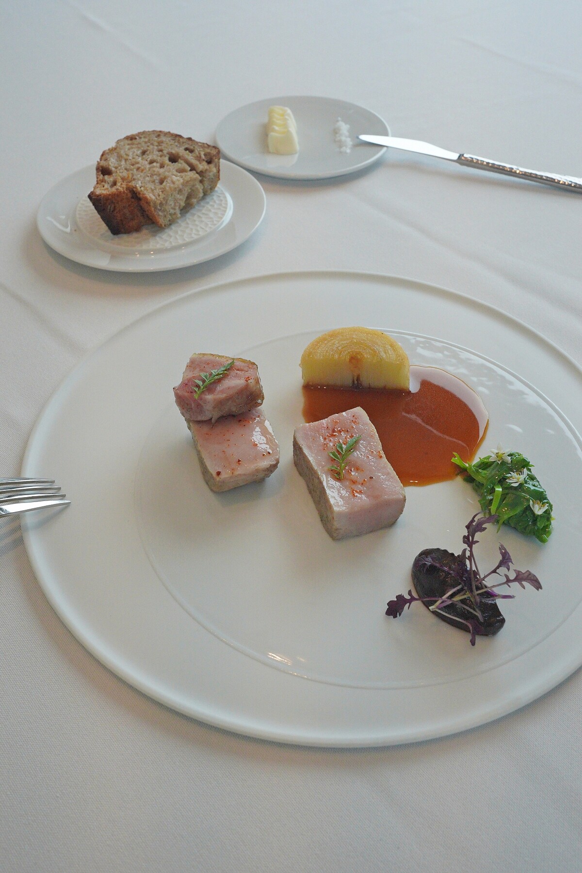 主菜為巧克力豬里肌,以完美熟度呈現,保留了肉質與鮮嫩的口感,搭配上馬鈴薯做的千層派,做工精緻味道細膩;並選用少見的將台灣產的山蘇作為配菜,將其切成細絲後炒製,嚐來脆口甘甜,底部為豬肉熬製的醬汁,一旁則襯有雲林黑蒜製作成的黑蒜泥,此道菜餚將各式口感、風味做了完美的搭配,為整套餐點中的最精彩之處。 並會隨餐附上廚房自製的酸種麵包,從酵母培養到製作都不假人之手,外酥內軟,能搭配發酵奶油以及法國鹽之花一起享用。