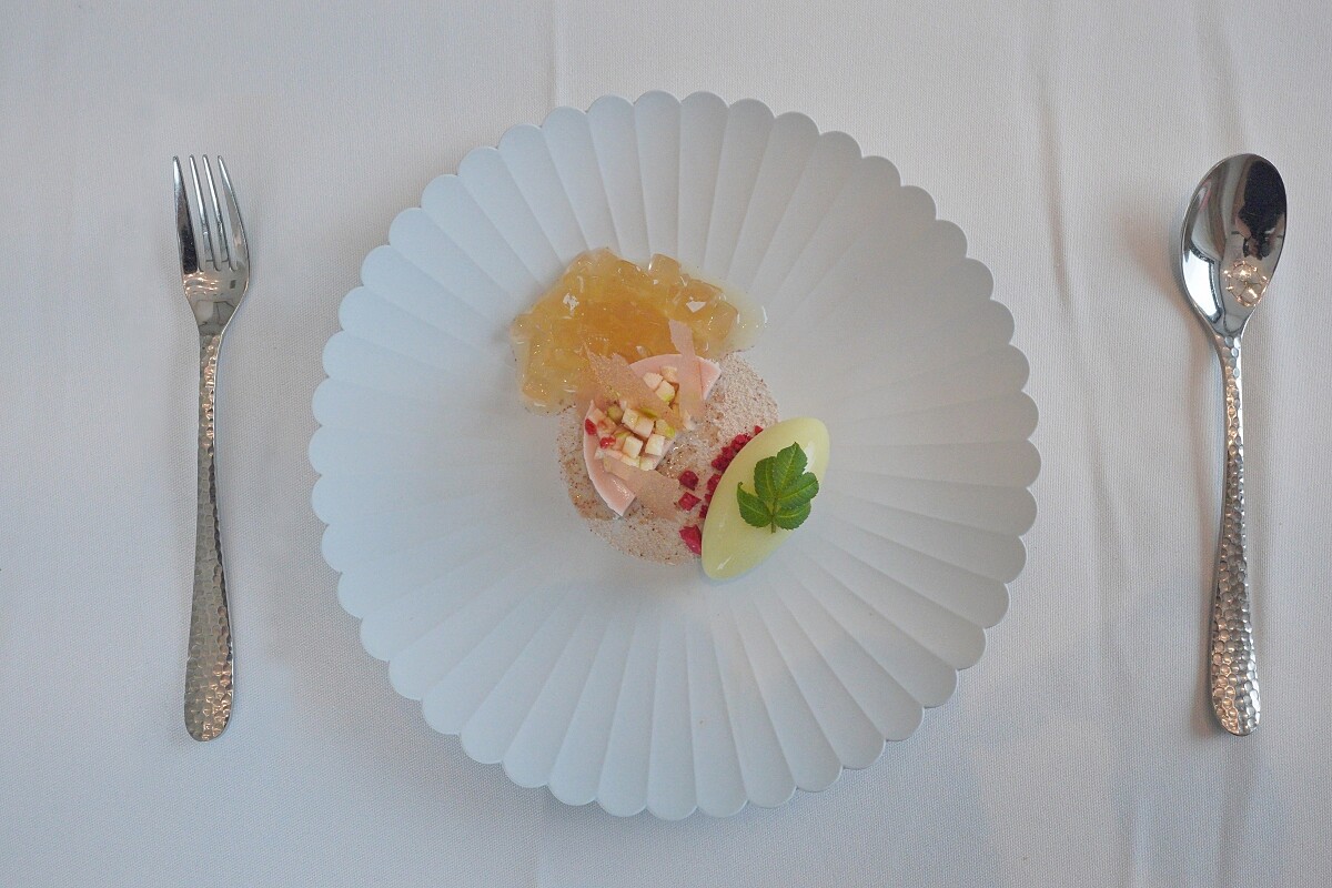 此道接地氣的甜點展現了主廚對台灣小吃、風味風味搭配十分熟稔,來自台灣人習以為常的梅子芭樂的搭配,將紅心芭樂製作成慕斯,而綠芭樂則做成了 Sorbet,搭配上梅子製作成的糖片,以及柚子風味的愛玉果凍、新鮮芭樂果粒,每一口既熟悉又新鮮。
