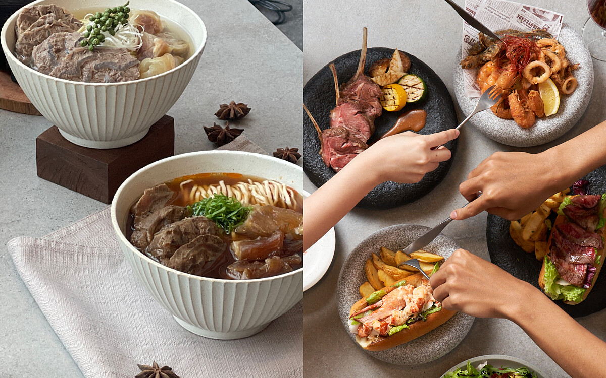 「紅燒牛肉麵」使用腱子心,先燉煮入味後再炭烤的獨家工法,使用日本「炭中之王」備長炭,只為達到火侯穩定、保留牛肉最鮮美的肉質。加上手工炭燒烙紋使牛腱充滿煙燻炭火香氣,提升香氣並給您同時品嘗炭烤牛排加牛肉麵的頂級雙重美味!「清燉牛肉麵」保留了美國穀飼牛的香醇氣息,腱子心以先蒸煮後滷製的方式製作,完美呈現咬勁與豐富肉汁香氣,搭配上中式燉煮與法式澄清雙倍工法的湯頭,而紅白嚴選的新鮮藤椒在湯頭中煮沸後釋放的迷人獨特香氣完美結合,一口咬下齒唇留香。