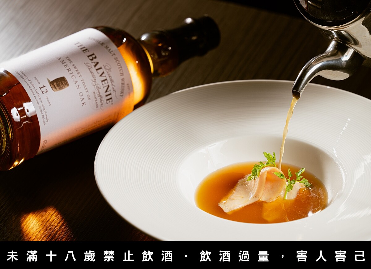 主廚將湯底以雞骨與雞腳細火慢熬二天後,再加入烏殼綠竹筍熬煮五小時增添風味,並加入細緻軟嫩的舒肥雞胸肉,最後融合百富故事系列糖心橡木12年單一麥芽威士忌,雞湯熱氣更顯單一麥芽威士忌獨有的糖果、柑橘水果和香草味酒香氣,呈現獨特醉人風味,濃醇更香甜。