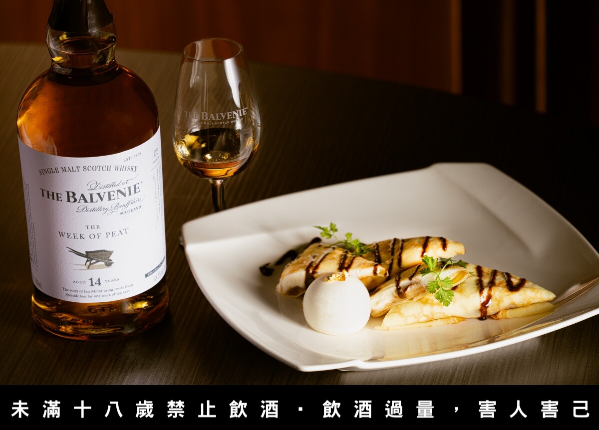 復刻古法,使用每年只有一週會產出的泥煤味麥芽,給予蜂蜜水果風味的百富一抹細緻煙燻香氣。搭配「百富14年泥煤週威士忌風味焦糖香蕉法式可麗餅」,內餡以北海道四葉奶霜配上自製焦糖舒肥香蕉,軟嫩彈性的法式薄餅包裹,最後噴灑上百富故事系列14年泥煤週單一麥芽威士忌,甜美與個性的碰撞,是難以被預測的絕妙滋味。