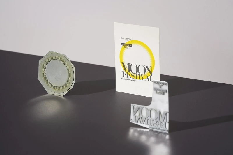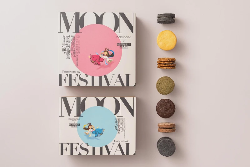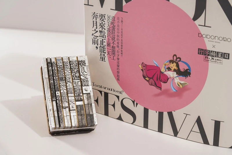 「嫦娥奔月」、「嫦娥邀月」中秋禮盒翻玩鉛字元素,中文字選用宋體,由《日星鑄字行》撿字排版,搭配《波波諾諾》獨家繪製二次元嫦娥,整體設計時髦又充滿童趣感!