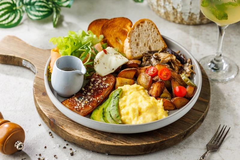 由厚培根、燻鮭魚、生菜、牛番茄、酸黃瓜、薯條、太陽蛋以及自製鮮奶吐司組成,搭配出最療癒口感!
