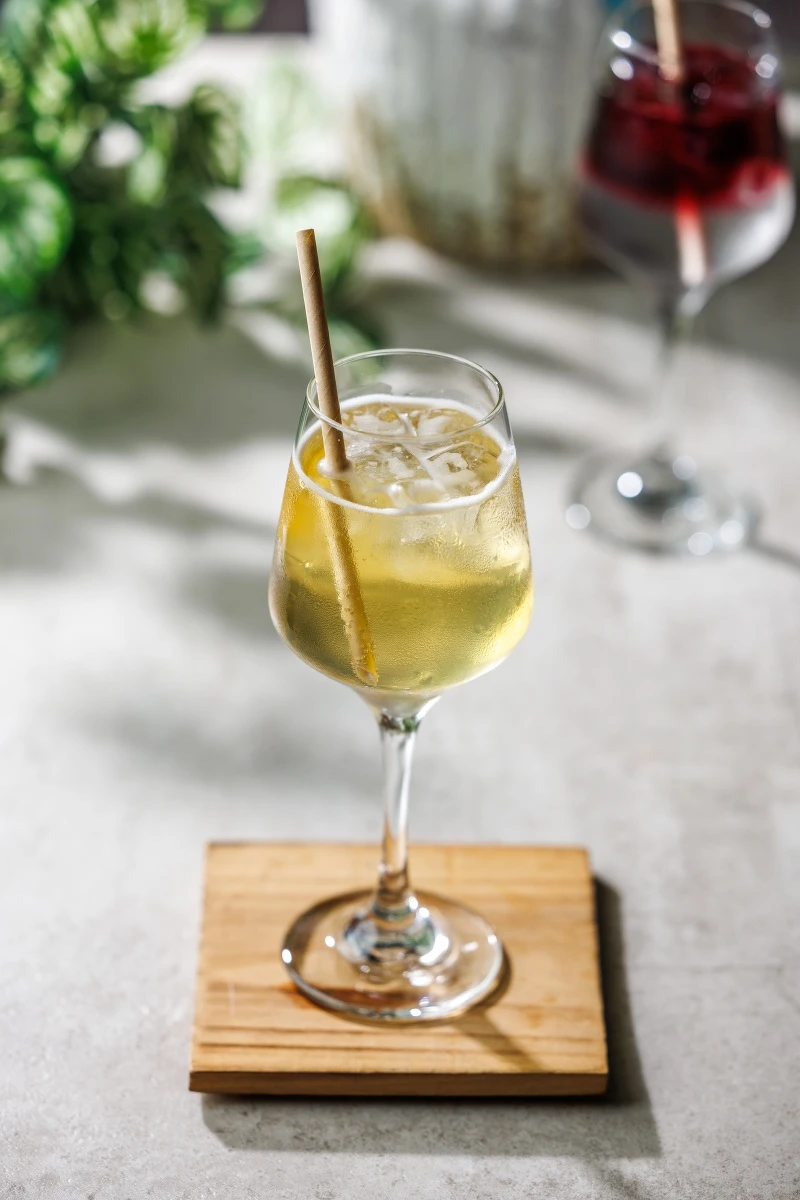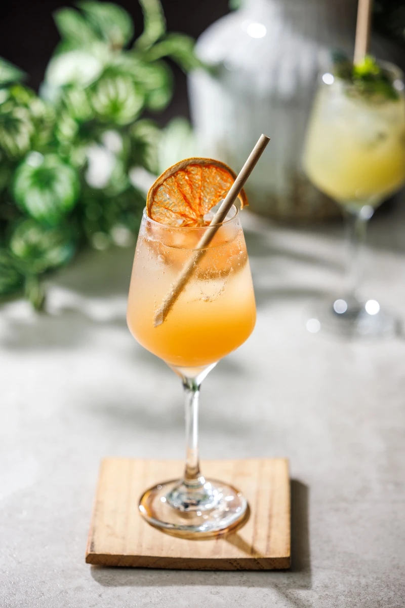 以不甜氣泡酒為基底,加入自製風乾葡萄柚、氣泡水,細細品嚐葡萄柚果香,的清爽滋味!