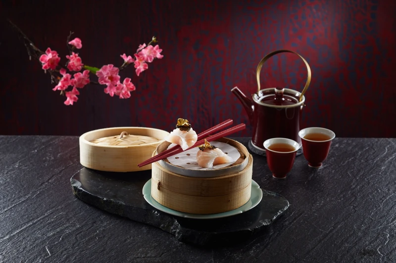 此次「雙城粵饗」套餐共有8道精美菜色,全都為兩位主廚廖晉輝與蘇權暉拿手之作,除了食料講究且做工繁複,呈現出引人入勝的當代粵菜風味及面貌,餐點包括了金箔黑松露蟹餃皇、金箔百香果香芒脆蝦球、鮮蟹肉石榴球、松茸日月魚燉螺頭、鴻圖遼參燴珍珠龍膽、翼豆年糕蔥爆頂級澳洲和牛、藍鑽蟹肉燴稻庭麵、楊枝甘露。