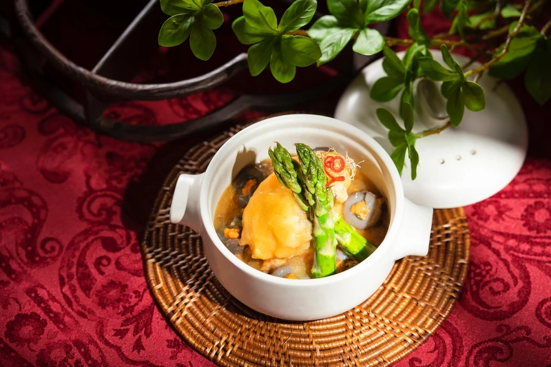 廖主廚選用整條1.2公斤的珍珠龍膽石斑(又稱龍虎斑),將魚肉去骨切片後大火翻炒,使其外層帶點焦香,並以紹酒賦味,另將魚骨熬製成濃郁湯色備用,將滑嫩的雞蛋豆腐鋪底,加入炒香的魚片、泡發三日的遼參、鹹鮮的蟹黃,與魚骨湯一起烹煮,起鍋前以少許花雕酒繞鍋一圈添香,肉質細嫩且富含膠質的珍珠龍膽石斑,與彈牙遼參和滑嫩的雞蛋豆腐堆疊出層次口感,蟹黃畫龍點睛的提鮮,成就這道細緻濃醇的極品海鮮。