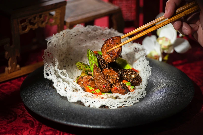 主廚選用日本A4等級和牛肋眼,因其脂肪雪花分佈均勻適中,最能呈現和牛的口感。將牛肉切成塊狀,略用生抽、生粉裹覆再以旺火快煎鎖住肉汁,再與蒜蓉、干蔥、蘆筍一起大火快炒,最後加入義大利黑松露醬和帶有小麥與蕈菇香的羊肚菌,賦予豐潤牛肉多層次口感與濃郁香氣,每一口都讓令人陶醉!