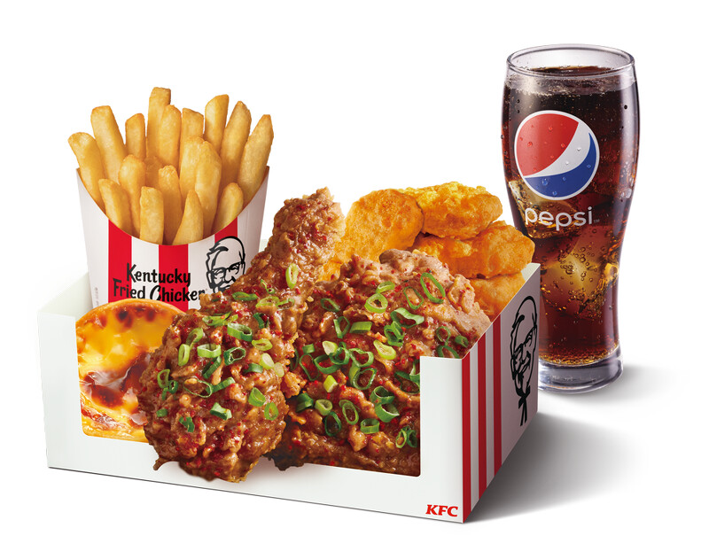 內容物:蔥麻上癮青花椒脆雞x2+咔啦脆雞x2+上校雞塊x4+香酥脆薯(中)x1+原味蛋撻x2+百事可樂(中)x2
