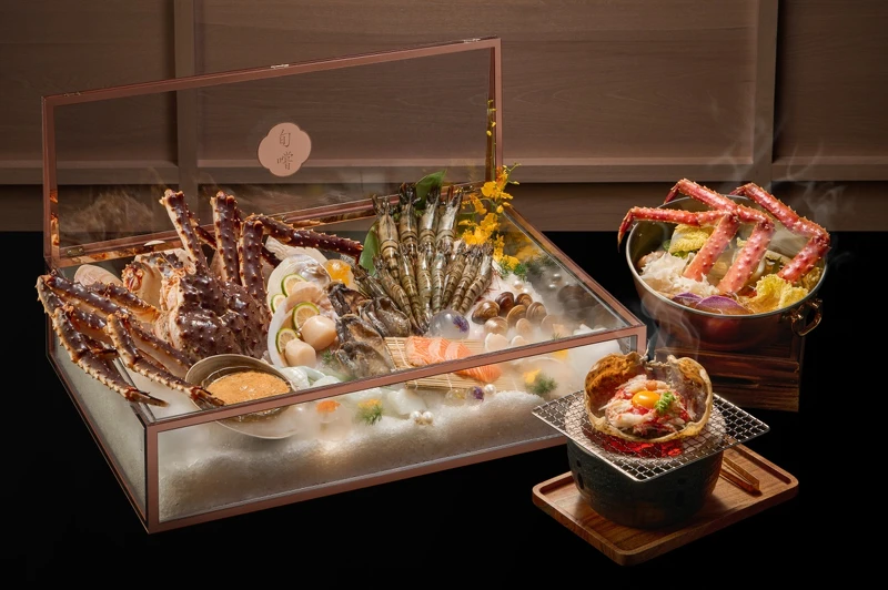 以珍貴珠寶盒概念呈現,有帝王蟹、南非活鮑魚、霸王草蝦、草蝦、北海道生食級干貝、龍膽石斑、現流鮭魚、澎湖小卷、吋蛤、帝王蟹蟹膏等十種食材,象徵十全十美。除了下鍋涮煮外,會另外在桌邊製作日本傳統的濱燒美食甲羅燒,將帝王蟹蟹肉、雞蛋、蟹味噌燒煮後,搭配蛋燒、鱒魚卵、法國麵包一起享用,增添不同風味。